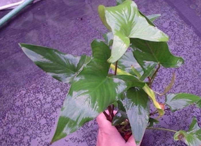 Описание: Болотное растение с ползучим, толщиной до 1,5 см корневищем. Черешок длиной до 63 см, с влагалищем, у сильных экземпляров покрыт колючками. Место крепления черешка под листовой пластинкой длиной до 1 см. Листовая пластинка кожистая, от копьевидной до почти трехраздельной; средняя доля от ланцетной до узко-яйцевидной или обратнояйцевидной, размером до 26 х 12 см, верхушка листа от заостренной до острой; боковые доли размером до 21 х 7 см, основание острое или тупое. Лист цельнокрайний.