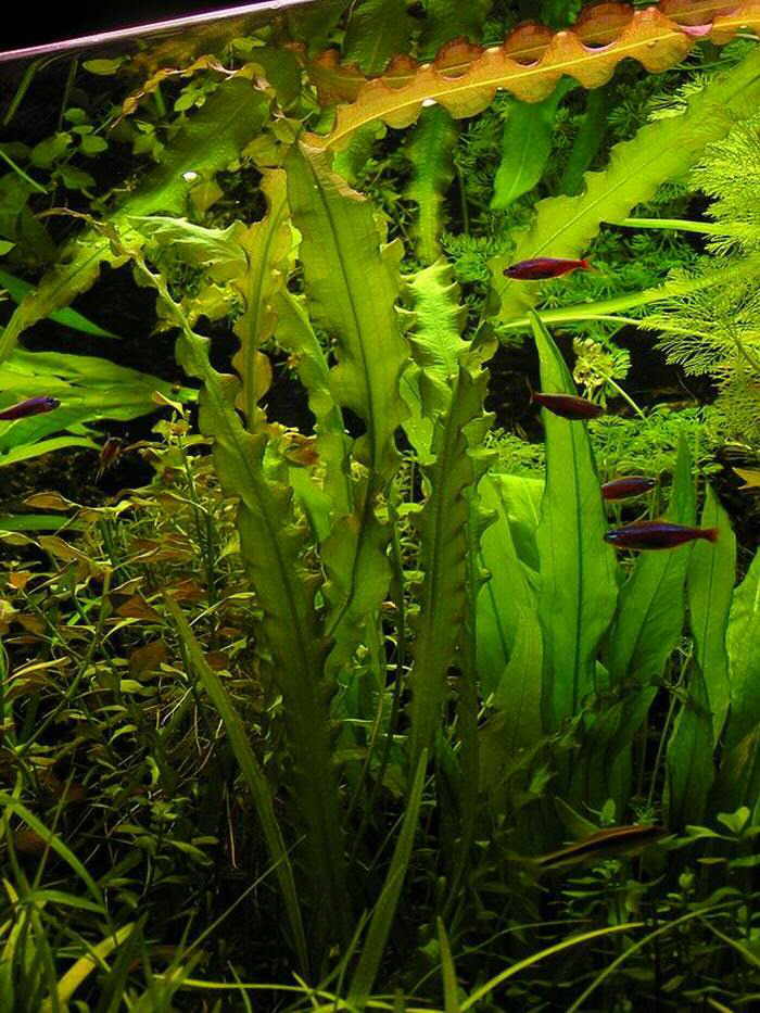Освещение. К условиям освещенности растение не очень требовательно. Оно выдерживает некоторое затенение, может расти в неплотной тени других, более крупных растений. При значительном недостатке света растение начинает вытягиваться, окраска и рисунок листьев ухудшаются. Для апоногетона курчавого пригодно как естественное, так и искусственное освещение. Подбирать освещение надо индивидуально в зависимости от конкретных условий (расположение аквариума в комнате, плотность засадки растениями, наличие плавающих растений и т. д.). Для искусственного освещения, которое может быть верхним и боковым, можно использовать люминесцентные лампы и лампы накаливания. Продолжительность светового дня в зависимости от конкретных условий может быть от 10 до 14 часов.