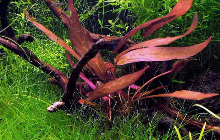 Одно из самых красивых и интересных растений тропического аквариума. Достигает высоты 50 - 60 см. Листья барклайи обладают очень красивым шелковистым блеском, они оливково-зеленые сверху и фиолетово-красные с нижней стороны. Растение очень нежное и весьма требовательное к условиям содержания. Равномерно растет в аквариуме в течение всего года.