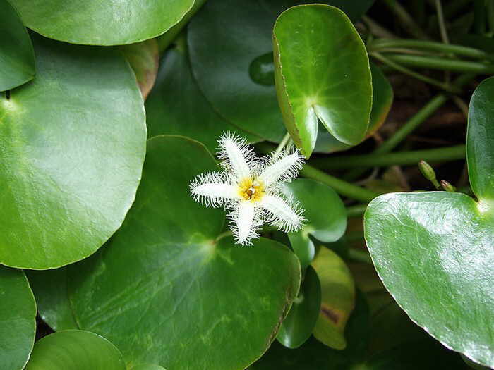 Описание: У болотноцветника вытянутое корневище с сильно развитыми придаточными корнями. Стебель длинный с почками, из которых формируются молодые листья и цветочные органы. Листья плавающие, сердцевидной формы с глубоким и широким вырезом у основания, доходящим в поперечнике до 15 см. Листья зеленого цвета с гладкой и кожистой верхней стороной и четкими жилками. В благоприятных условиях болотноцветник цветет пятилепестковыми цветками белого цвета с желтоватой серединой, покрытыми «волосками». Растение может достигать в высоту до 1 метра, но это зависит от уровня воды, в котором оно растет.