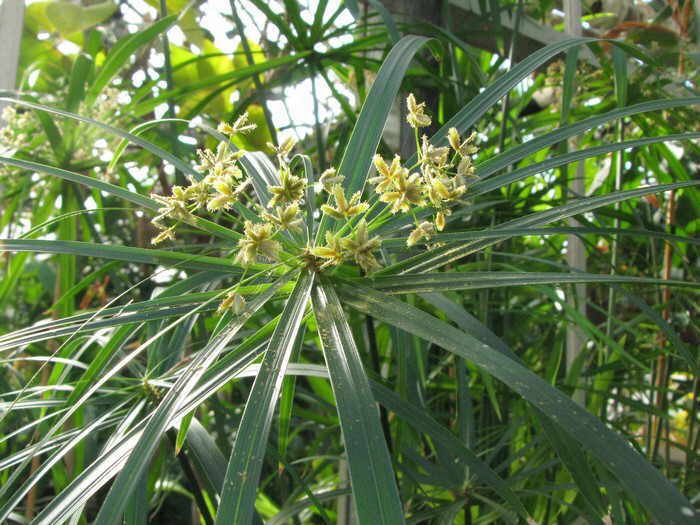 Описание: Это крупное вечнозеленое многолетнее растение с оригинальными узкими листьями, собранными в мутовки зеленого цвета и сидящие на длинных трехгранных черешках. Листья узколинейные, до 20 см длиной и 1 см шириной, поникающие. Ось колосков без сочленения. Кроющие чешуи расположены в два ряда. Взрослые растения образуют кусты высотой до 70 - 120 см