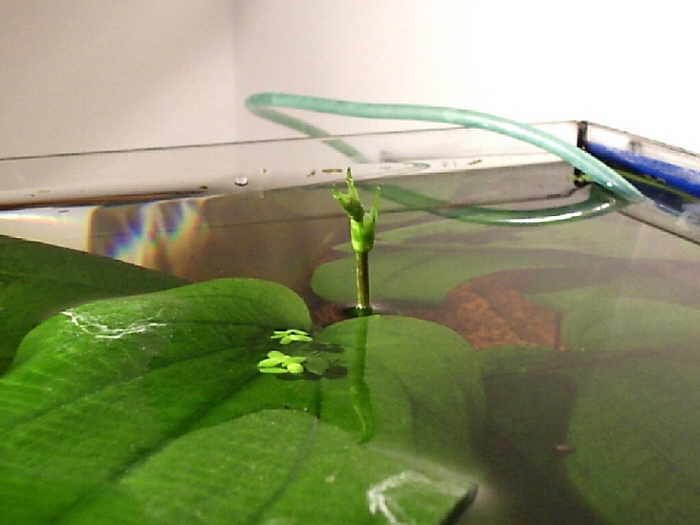 Размножение. Размножается растение в условиях аквариума чаще всего вегетативно, путем образования дочерних растений на цветочных стрелках. При этом на каждом усе одновременно появляется по одному растению, редко - по два, как правило, на самом кончике. После образования 2 листочков молодое растение с кусочком стрелки лучше всего отделить от материнского и пересадить в отдельную плошку с крупным песком, куда добавлены ил и глина. На оставшейся у материнского растения части уса вновь появляется дочернее растение, с которым поступают так же, как с предыдущим. Нередко цветочная стрелка обламывается при манипуляциях, тогда этот обломок цветоноса с ростовой почкой следует оставить плавать на поверхности воды. Через довольно продолжительное время на нем появляется маленькое растение, которое также сажают в отдельную плошку.