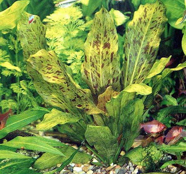 В нашей стране это растение появилось только в начале 80 -х годов. Это один из самых низкорослых широколистных эхинодорусов. Растение выглядит в аквариуме чрезвычайно привлекательно. Оно образует плотную розетку сердцевидных, листьев, покрытых мелкими коричневыми крапинками. Выращивать его можно в любой емкости, так как диаметр розетки обычно не превосходит 20 - 25 см, а высота ее не более 10 см. Размещать эхинодорус следует на переднем плане аквариума. Растение приобретает все большую популярность среди аквариумистов благодаря своему оригинальному виду и невысокой требовательности к условиям содержания. В течение всего года оно прекрасно растет в толще воды и размножается.