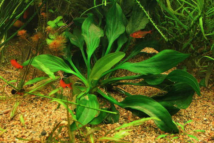Содержание: Высаживают растение в аквариуме на среднем плане. В приемлемых условиях эхинодорус портоалегренский приобретает пышную форму - ширины до 30 см и высоты 20 - 25 см. В одном кусте растения обычно растет 15 - 20 листьев. Следует знать, что листья молодого растения являются излюбленной едой улиток, благодаря которым его листья сплошь покрыты мелкими дырочками. Растение прекрасно растет и во влажных условиях оранжереи.