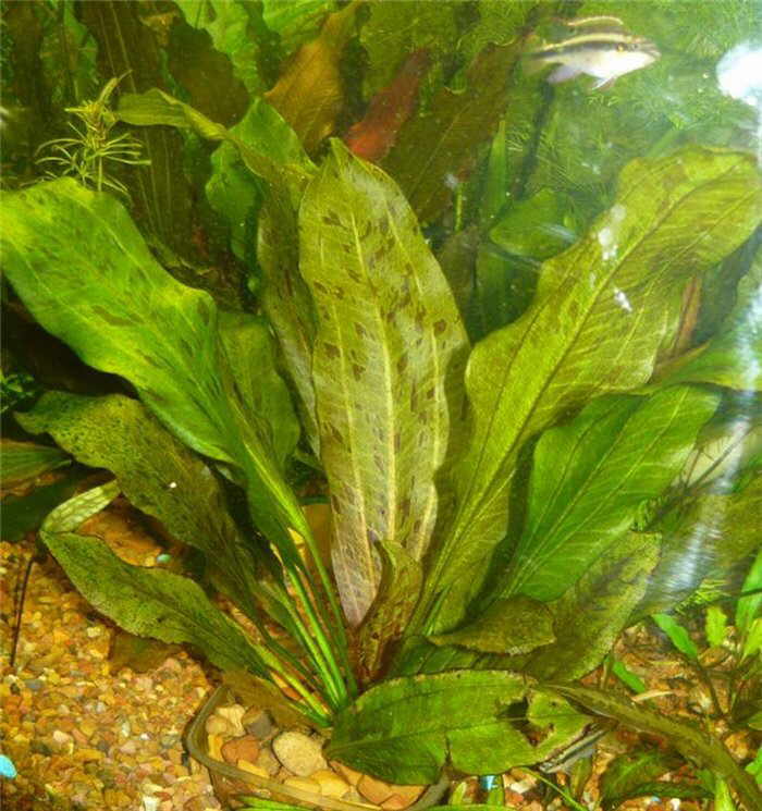 Содержание: Аквариум в котором имеет смысл высаживать эхинодорус оцелот должен иметь объем не менее 100 л и высотой от 50 см. Возможно, высаживать растение и в менее объемный аквариум, но в этом случае разрастаясь эхинодорус займет весь его объем, а если аквариум еще и довольно низкий, то листья растения, достигнув поверхности воды, начнут расти над ней. Высаживать растение нужно в средней части аквариума. Следует учитывать тот факт, что под листьями растения не будет ничего расти, поэтому другие растения нужно высаживать подальше от него.