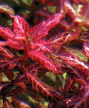 Гигрофила красноватая встречается в аквариумах не часто. Она представляет собой длинностебельное растение с узкими нежными листьями красновато-коричневого цвета, сидящими попарно на стебле. Листья достигают длины 7 - 8 см при ширине около 5 мм. Длина стебля может быть значительной.