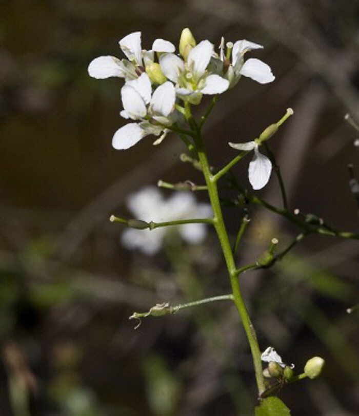 Фертильные растения длинного дня, высотой примерно до 70 см. Листья на соцветии очередные, неразделенные, с городчатым краем, с коротким черешком или сидячие, к верхушке становятся мельче, размером до 9 х 2 см, легко опадают. Соцветие - кисть с множеством цветков на цветоножках длиной 0,5 - 1,5 см. Цветок размером около 1 см. 4 зеленых чашелистика, длиной 3 мм. 4 белых лепестка венчика, лопатчатых, длиной 5 мм. 6 тычинок, длиной примерно 3 мм. Пестик с рыльцем несколько длиннее, чем тычинки, постоянный Завязь 3 мм. Плод - стручочек 5 - 8 мм длиной.
