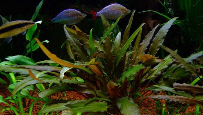 Растению очень полезна подкормка комплексными минеральными удобрениями с микроэлементами. Обязательно вносить в воду 1 - 2 раза в месяц соли двухвалентного железа, без которых листья растения не приобретут яркой окраски.