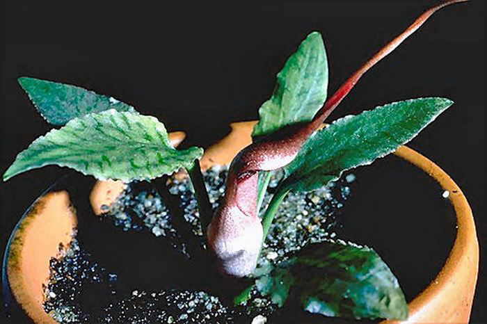 Кроющий лист 10 - 15 см, трубка 1 - 2 см, пластинка покрывала 8 - 11 см длиной, удлиненная хвостовидно-заостренная, ± наискось закрученная, изнутри очень морщинистая, пурпурного цвета. Воротничок пурпурно-черный. Женских цветков 5. Мужских цветков примерно 30. хромосом 2n = 34.