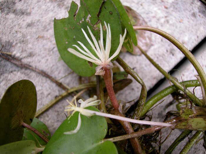 Описание: Стебель очень короткий, находится в 2 - 3 см от поверхности воды, от него вниз идет пучок белых прямых корней, а вверх - короткие черешки (у водокраса они более длинные) с круглыми обсыхающими плавающими листиками. Листья округлые, с вырезом при основании, в разрезе довольно толстые - до 0,5 см (у водокраса пластинка листа значительно тоньше), сверху плотные, ярко-зеленые, снизу серебристые из-за многочисленных аэрокамер в ткани листа. Поверхность пластинки снизу рыхлая, всасывающая. Цветки имеют тонкие, вытянутые лепестки, цветки разнополые, могут находиться как на одном растении, так и на разных: на одних - только мужские, на других - только женские.