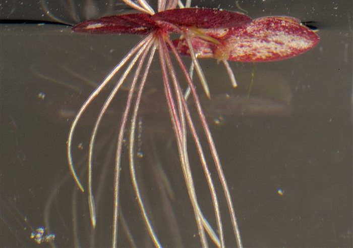 Описание: Многокоренник обыкновенный обычно плавает на поверхности водной среды медленно текущих и стоячих водоемов. От пластинки отходят тонкие корешки. Сам стебель округло-яйцевидный, а корешки белые или красноватые. Цветение непостоянное, обычно в мае или июне. Лицевая сторона листовой пластинки обладает темно-зеленым окрасом, а оборотная – фиолетово-пурпырным. Сама пластинка в диаметре не превышает шести миллиметров. Соцветие представляет собой совокупность одного женского и двух голых мужских (однотычинковых) цветков. Самоопыление невозможно.