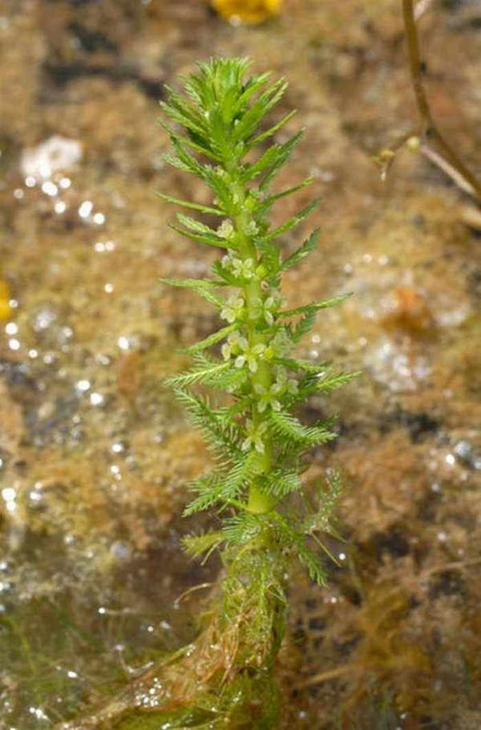 Описание: Перистолистник мутовчатый принадлежит к многолетним растениям. Его листья имеют большую длину, порой до 3 м. Растение растет полностью под водой и только во время цветения оно выпускает цветонос, который поднимается над поверхностью воды. Одной из примечательных особенностей растения является то, что на нем имеются два варианта листьев. Листья, которые расположены под водой имеют нитевидную структуру и состоят из 4 - 5 листиков собранных в мутовки, которые в свою очередь располагаются на расстоянии около 10 мм друг от друга. Надводные листья перистые в виде пучка. Их размер ориентировочно в 2 раза больше длины цветков, расположенных над поверхностью воды. Растение может иметь женские, мужские и двуполые цветки крестовидной формы. Причем лепестки у цветов, в зависимости от их пола, имеют различную окраску. Так, лепестки мужских цветов – белые, ну а у женских они вообще крохотные.
