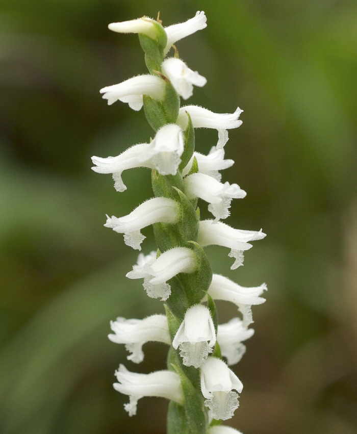 Цветочный стебель прямой, цилиндрический, высотой до 75 см, толщина у основания до 7 мм. Листья на стебле очередные, к вершине цветоноса их размер уменьшается. Цветки собраны в простое колосовидное соцветие и расположены на колосе по спирали. Цветки обоеполые, достаточно крупные, белые, без запаха. Строение цветка обычное для однотычинковых орхидных. Период роста цветочного стебля с образованием и раскрытием цветков происходит в течение 4 месяцев.