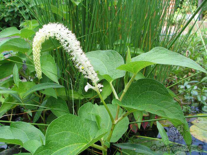 Цветы его мелкие, без чашечки и венчика, с белыми тычинками, расположенные плотными, несколько согнутыми кистями. Кисти эти от 15 до 25 сантиметров длины и на ножках, развивающихся напротив листьев в верхней части стебля.