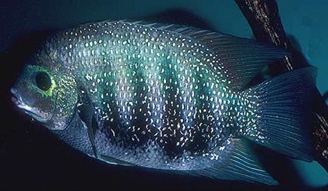 Тело рыбки имеет высокое тело дисковидной формы. Окраска тела может изменяться от светло-коричневого до темно коричневого цвета. На всей площади тела присутствуют мелкие светлые точки. Также на теле имеются 6-8 широких вертикальных полос темно-зеленого цвета. Половые признаки выражены слабо. Взрослые самцы немного больше самок, а у самок более округлое брюшко. В природных условиях размер рыб достигает 45 см, в условиях аквариума их размер значительно меньше.